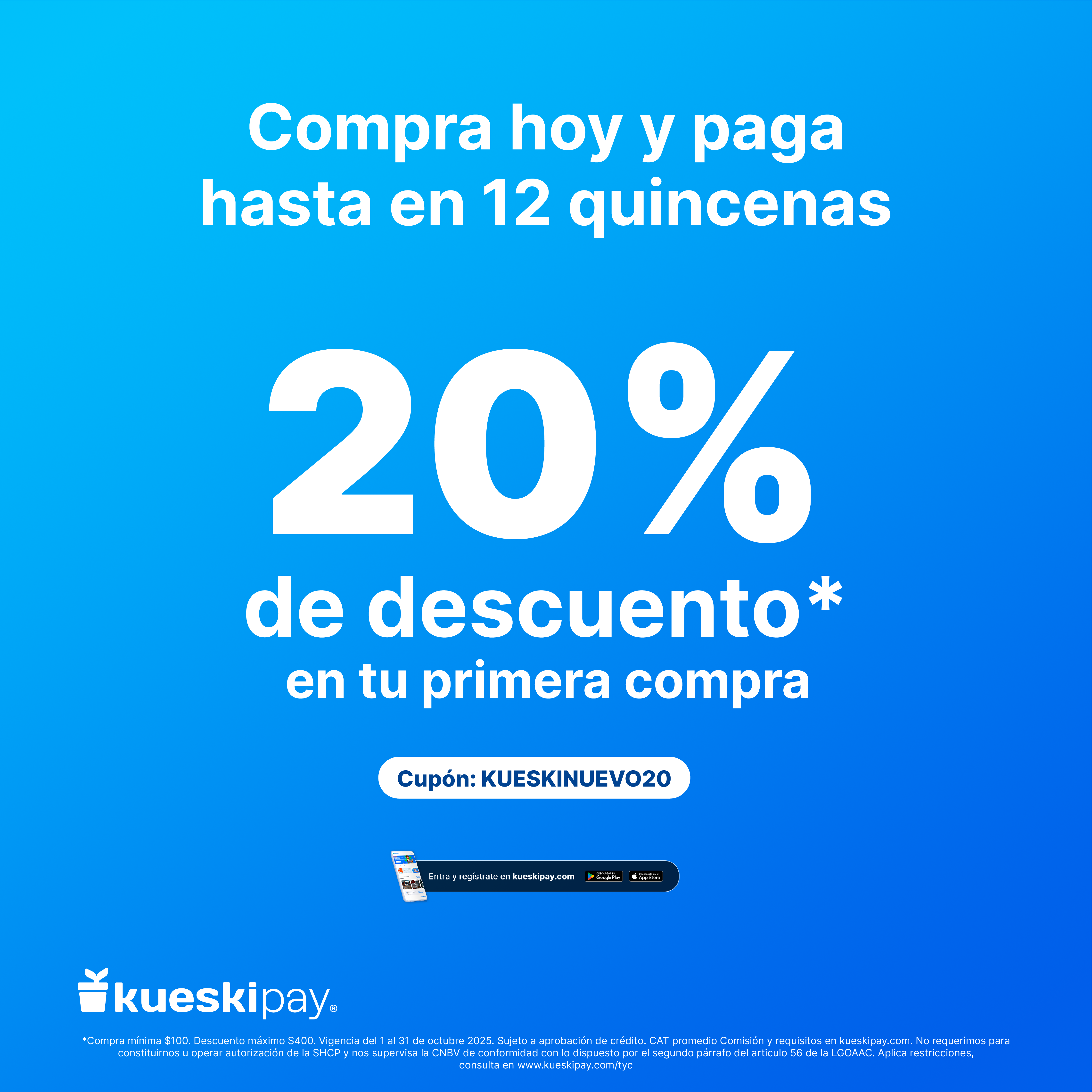 Aprovecha un 20% de descuento en tu primera compra pagando con KueskiPay.